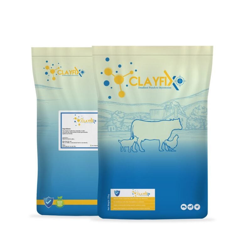 Clayfix Plus is a powerful feed additive that effectively binds and adsorbs harmful mycotoxins present in animal feed. It contains advanced toxin-binding agents that help protect dairy cows from reduced feed intake, poor performance and health disorders caused by mycotoxin contamination. This product does not interfere with other feed additives or essential nutrients. It improves overall feed quality by controlling excess moisture and is highly recommended during periods of high moisture conditions. Clayfix Plus supports immune functions, ensuring consistent growth and productivity. Highly effective and safe feed additive to overcome mycotoxin-related issues in animal production.