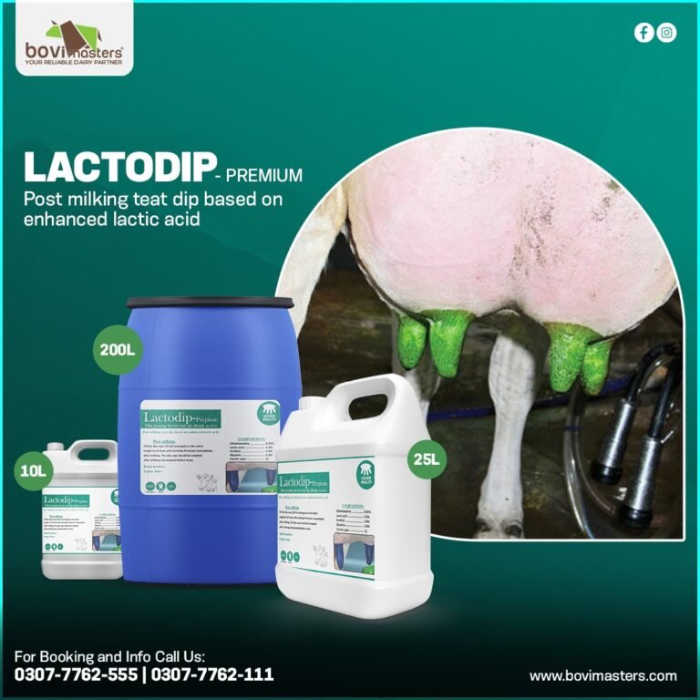 Lactodip-Premium is a ready-to-use teat dip to protect and care for your dairy cows. It is formulated with a lactic acid base and provides effective antimicrobial action that reduces the risk of mastitis by eliminating harmful bacteria on the teat surface. Its advanced film-forming technology provides a protective layer that retains moisture, promotes healthy teat skin and helps prevent irritation and roughness. Quick to apply and dries quickly without leaving sticky residues that ensure comfort for your dairy cows. This Lactodip-Premium is perfect for your animal for post-milking use, combining hygiene, protection and skin care in a single, convenient solution for modern dairy management.